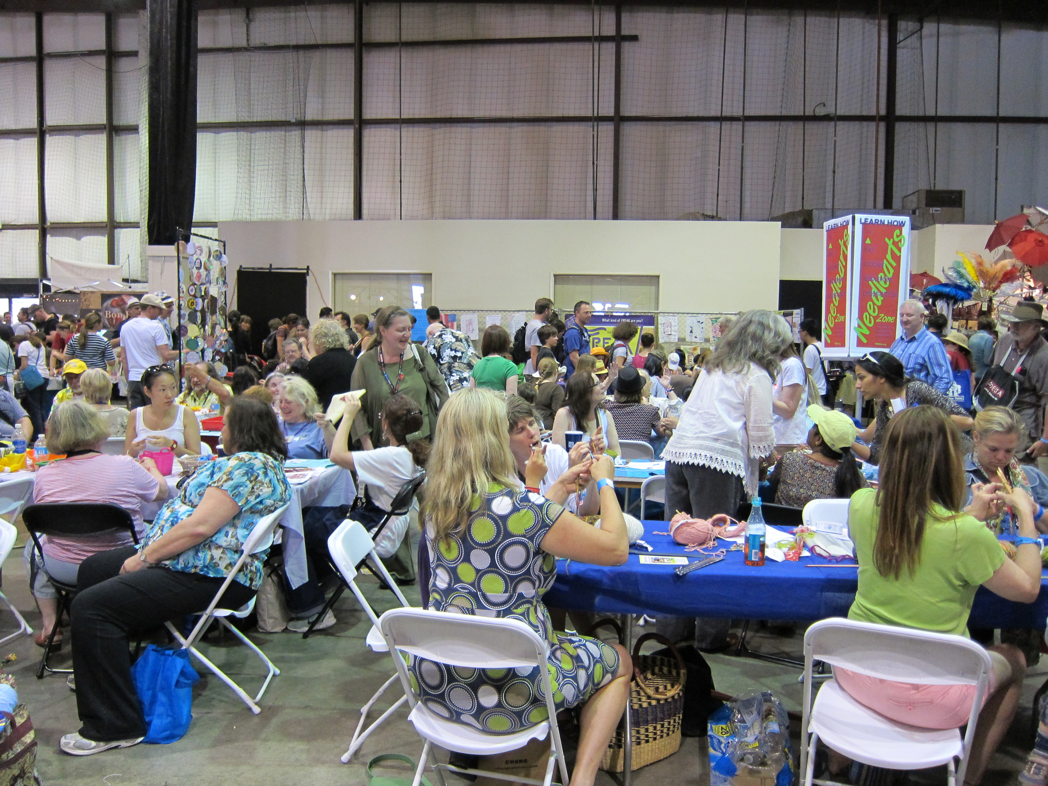 The NeedleArts Zone teaches needlearts: Crochet, Cross-Stitch, Knitting, Needlepoint and Spinning! Students go home with their learning supplies, and there is no cost for lessons or supplies. Look for our outrageously oversized knitting needles!